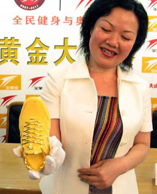5月15日,中國城市健身長跑黃金大獎賽組委會工作人員在展示純金鞋。