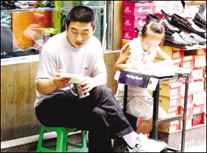 這位小學(xué)生在鞋攤旁專心地做暑假作業(yè),一旁的家長(zhǎng)一邊照看生意一邊為孩子檢查作業(yè)。