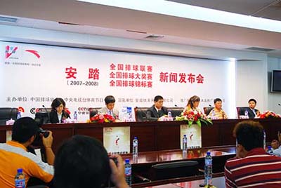 北京時間2007年9月21日,安踏(中國)有限公司冠名贊助2007-2008全國排球聯(lián)賽新聞發(fā)布會在國家體育總局二樓會議廳召開。出席發(fā)布會的有國家體育總局排球運動管理中心主任徐利、黨委書記張蓉芳,中央電視臺體育頻道副總監(jiān)楊斌,安踏董事局主席兼CEO丁志忠,中視體育推廣有限公司代表等。另外還有來自首都各大新聞媒體的三十余位記者到場參加了發(fā)布會。國家體育總局排球運動管理中心競賽部副主任呂雅君博士主持了發(fā)布會。