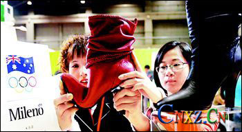 昨天(9日)上午,幾款2008年奧運會澳大利亞國家隊禮儀用鞋出現在第四屆中國國際鞋業博覽會上。展示鞋并沒標明哪幾雙是奧運禮儀用鞋,但所有展示鞋都能達到完全彎曲的舒適度表現讓參觀者頗為關注。
