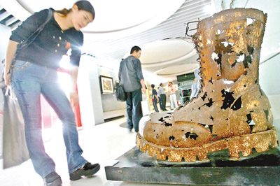 昨日,廣東工業大學李青、張洪亮兩名教授聯手辦藝術作品展,圖為一只設計獨特的大鞋吸引了參觀者的目光。高鶴濤 攝