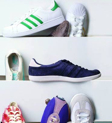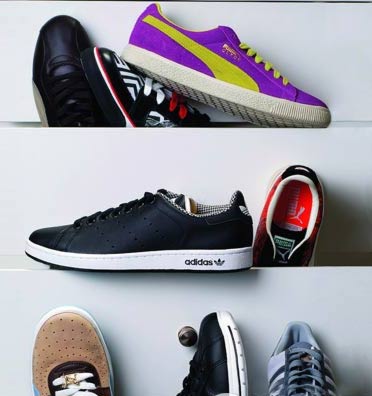 綠色條紋白底Adidas sneaker/棕色Puma sneaker/白色金色條紋復古款Adidas sneaker/藍白色復古款Puma sneaker/紫色Adidas sneaker/紅色帆布作舊Converse/紫色Nike復古足球鞋/灰色Puma sneaker(從左到右,從上至下)