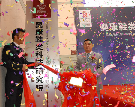 奧康鞋類科技研究院院長、奧康集團副總裁王振權(右)和中國皮革和制鞋工業研究院高級工程師方巖為奧康鞋類科技研究院接牌