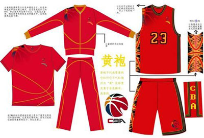 另一幅叫做“黃袍”的決賽作品,同樣以紅色為大基調(diào),然后用類似籃球上的條紋的黃色線條穿插其間,視覺達到平衡。CBA的標(biāo)志放在戰(zhàn)袍的肩部位置——強調(diào)把CBA放在了很重要的位置——扛在肩上。總冠軍T恤右側(cè)是熱情有活力的火焰條紋,卻又以左右不對稱的方式打破了中國的傳統(tǒng)。