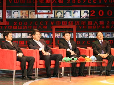 2008年1月15日CCTV《經(jīng)濟(jì)半小時(shí)》特別節(jié)目——中國(guó)年度經(jīng)濟(jì)人物評(píng)選“財(cái)富論道”在中央電視臺(tái)錄制。圖為節(jié)目現(xiàn)場(chǎng)嘉賓安踏鞋業(yè)集團(tuán)董事長(zhǎng)丁志忠(左一)、大連億達(dá)集團(tuán)董事長(zhǎng)兼大連軟件園股份有限公司總裁(左二)、皓月集團(tuán)董事長(zhǎng)叢連彪(左三)、天津港公司總裁于汝民(左四)。