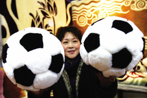 昨日,一名工作人員在展示兩款羊毛足球。當日,第三十四屆中國國際裘皮革皮制品交易會在北京中國國際展覽中心舉行,來自國內(nèi)外的近300家裘皮機構和企業(yè)參加了本屆盛會。