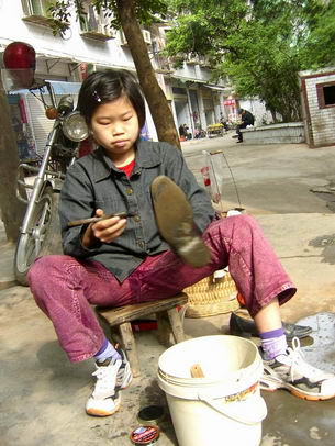 從2006年開始,在市城區馬房街就有一個小小的身影蹲在路邊擦皮鞋——她叫唐小溢,12歲,大英縣河邊鎮人,擦皮鞋是為了給自己攢醫療費。