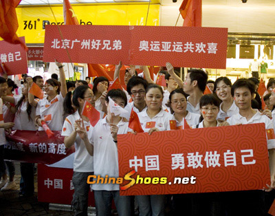 當(dāng)羽毛球世界冠軍關(guān)渭貞手擎火炬在人流中穿行,我們看到了圣火助威隊伍中361°的影子。在這片年輕人聚集的區(qū)域里,361°廣州分公司組織了近200余人在現(xiàn)場為圣火傳遞加油,他們將國旗貼在臉上,用力揮舞著國旗、五環(huán)旗及“中國 勇敢做自己”的旗幟,吸引了無數(shù)人共同加入進(jìn)來,在人們的記憶里打下一枚特殊的紅色印記。