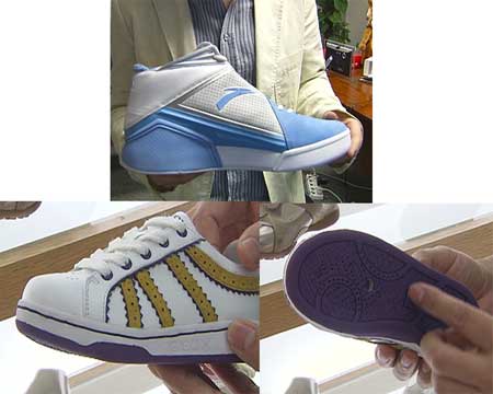 (上圖)這是安踏為斯科拉制作的在今年奧運會上穿的鞋,安踏鞋業的品牌總監徐陽告訴記者,拓展自有品牌,避免了人民幣升值帶來的影響,原材料上漲的沖擊也相對緩和;(下圖)是誠安鞋業的新產品空調鞋,還有個專利,誠安鞋業董事長許振坤意識到,即使是幫人代工也需要提高產品創新能力,企業才能夠生存。