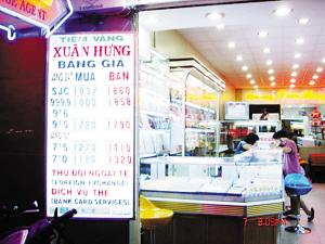 越南一家金店內(nèi)顧客寥寥,金店門前廣告牌上寫(xiě)著當(dāng)天的金價(jià)。 時(shí)報(bào)特派記者 張配吉 林燕輝 攝