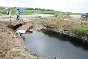 離水坑約10米遠(yuǎn)有一家皮具加工廠,工廠門口左側(cè)草坪上有兩個(gè)下水道井窖,井蓋四周草是黑色的,幾名工人正在鏟除這些已經(jīng)遭污染的草皮。13日在現(xiàn)場(chǎng)采訪時(shí),記者曾看見(jiàn)兩輛油罐車停在下水道口,一條粗大的抽油管伸到井窖里,從油罐車內(nèi)抽油。當(dāng)時(shí),一名正在抽油的男子告訴記者,是廠方安排他們來(lái)抽油的。