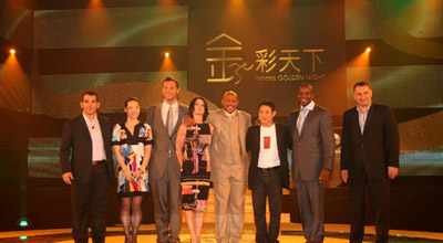 占地2000余平米的嘉里會展中心,擁有11米高的超大空間,當晚完全幻化為金色海洋,盡顯奢華,令人驚嘆。以金色紗縵為裝飾,兵馬俑雕像群以及身著金粉,并以古希臘服裝亮相、由真人演繹的雕像組群,更加突出了中國元素及奧運主題。阿迪達斯集團主席兼CEO赫伯特•海納,阿迪達斯品牌全球總裁艾里克•斯特明格均出席并致辭。前奧運體操冠軍科馬內奇,游泳冠軍伊恩•索普、羅雪娟,跳水冠軍高敏、國際著名功夫巨星李連杰均現身晚宴。當晚還穿插了精彩的擊鼓鳴鑼,沸騰的場面向世人宣布了北京奧運的到來,也將晚宴推向高潮!