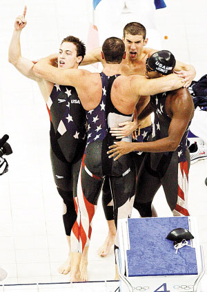 在前兩天進(jìn)行的游泳比賽中,一共誕生了8枚金牌,有7枚金牌的獲得者都身穿這件“神奇泳衣”,其中“神奇泳衣”中的領(lǐng)軍人物菲爾普斯一個人獨(dú)攬兩金,世界紀(jì)錄被不可思議地輕松打破,兩個項(xiàng)目分別是男子400米混合泳和男子4×100米接力。另外,澳大利亞水軍的領(lǐng)軍人物萊斯和特里克特分別獲得了女子400米混合泳和女子100米蝶泳的冠軍,鞏固澳大利亞游泳強(qiáng)國地位的同時還幫Speedo公司免費(fèi)打了不少廣告。
