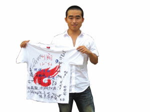 “你看,我這件奧運T恤的中間寫了個‘12″86’的數字,就是希望劉翔能夠打破羅伯斯創下的新紀錄。”柯文切要送給劉翔的這件禮物上,還有很多人的簽名,“這些簽名都是咱們晉江人對劉翔的支持!笨挛那懈嬖V記者,這件奧運T恤是他在8月8日那天準備的,每天他都拿著這件T恤到街上找人簽名,雖然天氣很熱,但看到很多人對他這個想法的支持,他覺得很開心:“大家一聽是要支持奧運,支持劉翔,都很爽快地簽下了自己的名字。”目前,T恤上大大小小的簽名已將近100個?挛那斜硎,他這幾天要繼續找人簽名支持,一直到8月18日劉翔參加比賽為止。