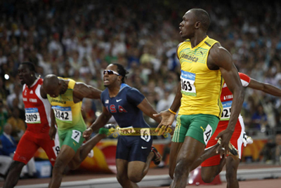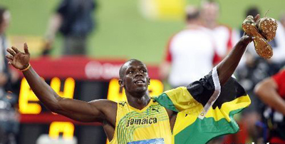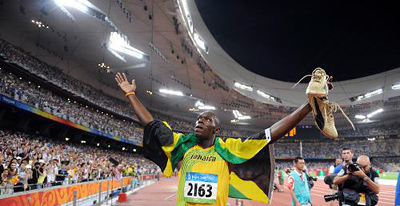 在北京奧運會百米決賽中,尤塞恩•博爾特(Usain Bolt)以9秒69的驚人成績奪得金牌,并打破了這個項目的奧運會紀錄和世界紀錄。賽后,尤塞恩•博爾特(Usain Bolt)誠意的地向牙買加隊的贊助商及運動鞋提供者彪馬表示感謝,來自彪馬的頂級賽跑釘鞋——Theseus II型鞋款在極大程度上幫助他順利奪冠。比賽中,尤塞恩•博爾特英姿颯爽地擊敗了對手Asafa Powell和Tyson Gay,新的百米紀錄保持者實現了金牌之夢——此刻正是他生命中最幸福的時分。