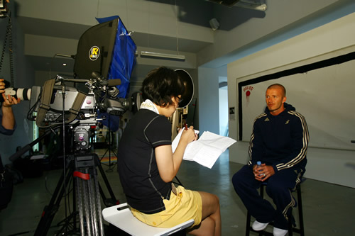 在阿迪達斯全球品牌中心門口豎立著的巨型奧運會中國體育代表團領獎服前,剛下車的貝克漢姆忍不住駐足留影,祝賀中國軍團這次取得的好成績。 貝克漢姆在阿迪達斯品牌中心接受了中央電視臺著名主持人水均益的訪談。