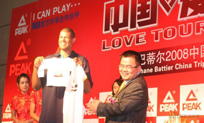 北京時間8月28日北京,NBA休斯頓火箭隊球星肖恩-巴蒂爾抵達北京,開始了他的“2008匹克中國愛心之旅”之旅。在抵達北京后不久,巴蒂爾參加了他的新戰靴發布會。圖為發布會上的精彩瞬間。