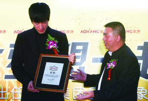2007年11月 22日 ,飛人劉翔受邀成為“奧康奧運圓夢行動特別形象大使”, 接受奧康集團總裁王振滔的特聘。圖/CFP