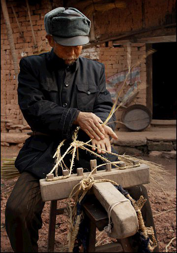 黃大爺從屋后端了張條凳出來了,條凳上擱了把稻草。他將稻草墊坐于條凳的一頭,草鞋耙鉤在條凳的另頭,一根“V”字形的木棍系在腰間后,準備工作便就緒了。老人看了看我:可以打了嗎?我點了點頭,從攝影包掏出相機站在一旁。打草鞋的工序簡單:搓好一根小拇指粗近兩米長的草繩,將草繩折為四股鉤掛于鞋耙齒上,尾端系于腰間的木棍上,繃緊草繩從前至后的編鞋底。當鞋底織到兩寸時,就要按預先設想的位置扭好前鞋耳。鞋耳共四處,前腳掌左右各扭四、五個,后腳跟兩側各兩、三個。最后捆后跟,并將草繩穿過鞋耳,一雙草鞋就算完工。