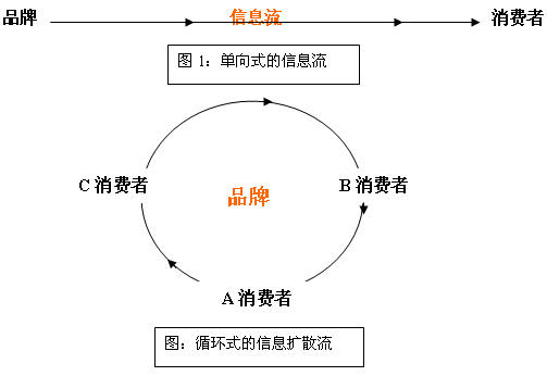 但在新的傳播環境中,未來的營銷信息流將是一種循環式的信息擴散傳播——將信息變得更具體驗性,每一個接觸信息源的消費者都會被信息內容、傳遞方式或者呈現的結果所打動,繼而自己產生對信息進行再次擴散的愿望,從而實現了信息的二次擴散。這對企業而言,不僅大大節約了傳播的費用,更重要的是人際網絡之間的信息傳播其有效性及接收率將更高。圖1與圖2所呈現的就是單向式信息流與循環式信息擴散的區別。