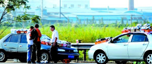 昨日下午,記者在順德南國路杏壇路段,意外發現兩輛粵S的小車,在車頂與車頭處擺滿了高檔鞋子在叫賣。
