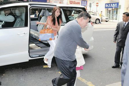 而呂麗君手拿的橙色Herm's手袋跟前日甘比拿的黃色是同款不同色,猶如姊妹手袋般。一行人午膳個多小時后,呂麗君與盈盈先離開,大劉則拖著母親上車,送母親回家。