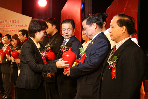 歷時8個月,經過多輪評選,“海西驕子·名城之光——紀念改革開放30周年泉州市杰出經濟人物和優秀人物”揭曉,并于09年1月6日在泉州音樂廳舉行了盛大頒獎典禮。我司許景南董事長以其非凡的“國際化視野”和“關注民生樂善好施”的時代精神贏得廣大評委和民眾的支持,成功當選“杰出經濟人物”,泉州市委副書記黃少萍為許董頒發了新年第一個獎杯和獎牌。