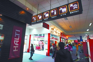 雪具大廳進門的正上方有類似空港的引導標識:去往廁所、去往水吧、去往滑雪服務柜臺……時間的長短本身就是體驗的重要部分,從進門到領取雪板,如果這個過程超過了20分鐘,等待就會讓人煩躁。十幾個窗口服務,上午的時候取雪具的人多,可以自動旋轉的標志牌上轉到“結算,取雪具”一面,到了傍晚時分,窗口標志牌切換到“結算,還雪具。”大廳的一側有消毒烘干雪鞋室,隔著透明的玻璃,來往的客人可以看到所有還回來的雪鞋會在這里進行消毒烘干,因為只有腳知道,伸進一雙黏濕的鞋里是什么感受。