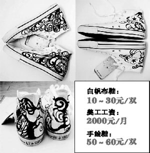 目前,一雙手繪鞋的價格在50~60元之間,而一雙尚未加工的手繪鞋,也就是白帆布鞋的成本卻要10幾元到30元。該店的美工有10幾人,這些美工基本都是從美術學院聘來的學生,每個美工的工資在每月2000元,由于人工成本高,而手繪鞋的售價卻無法提升,手繪鞋生意的利潤空間也就受到了制約。