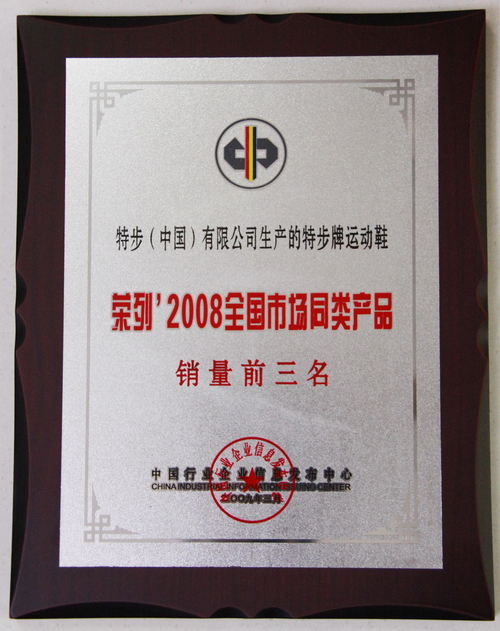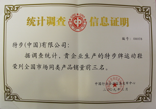 3月21日,由國家統計局中國行業企業信息發布中心主辦的第十三屆全國市場銷量領先品牌信息發布會在北京人民大會堂隆重舉行。憑借2008年優異的市場表現,特步牌運動鞋榮列2008年度全國市場同類產品銷量前三名,以無可爭議的實力書寫了運動鞋領域的銷量奇跡。