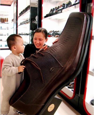 【中國鞋網】5月21日,一名女孩在鞋店觀看巨型皮鞋。