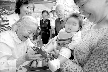 【中國鞋網】昨天上午,家住江東福明新家園社區的84歲老太太俞愛寶正在給一位嬰兒試穿她制作的虎頭鞋。俞老太制作繡花虎頭鞋已有60多年的歷史。當天,俞老太等一批民間手工制作高手會聚徐戎公園,一起向市民展示了刺繡、布藝、香袋、銅器、紙燈、花色糕點等傳統技藝,為“航運江東”文化遺產展示活動助興。