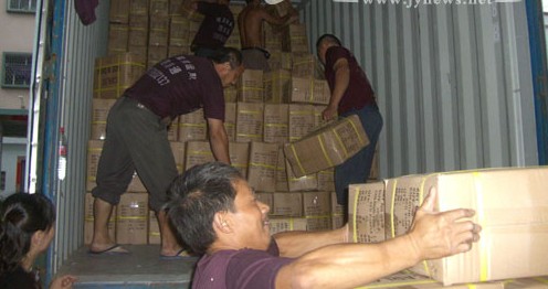 圖為榕城仙橋鞋業(yè)區(qū)某鞋廠一批輸埃及的鞋類產(chǎn)品正在裝上集裝箱貨柜車。