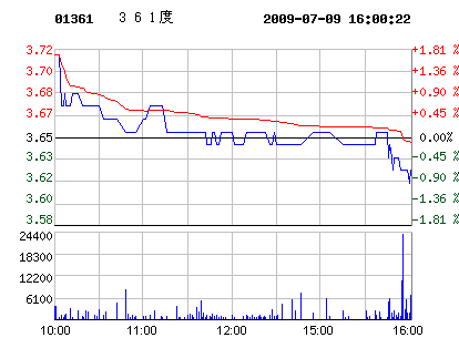 | 361度 代碼:01361.hk | 3.62 0.03 0.82% 2009-07-09 16:00:22 | 昨收:3.65 今開:3.71 成交:198,410 最高:3.71 最低:3.60 均價:3.63 流通:20.00億 市值:72.40億 換手:0.01% |