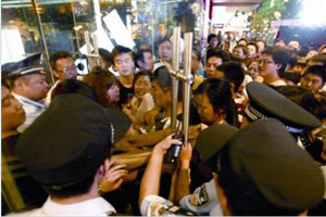東城區(qū)公安分局和東城區(qū)城管大隊(duì)派出多人到現(xiàn)場(chǎng)維持秩序。工作人員首先將店內(nèi)購(gòu)物結(jié)束的顧客從側(cè)門進(jìn)行疏散,保持店內(nèi)有足夠的空間。然后把守商店后門,嚴(yán)禁人員出入。警方則在前門拉起警戒線,要求等候的顧客到商店工作人員處取號(hào),依號(hào)排隊(duì),在警方的控制下分批入場(chǎng)。