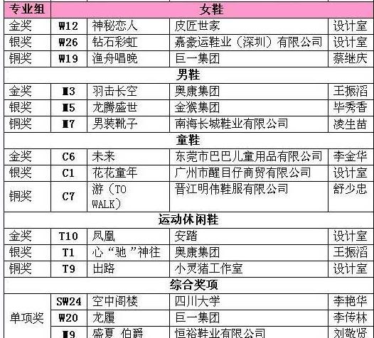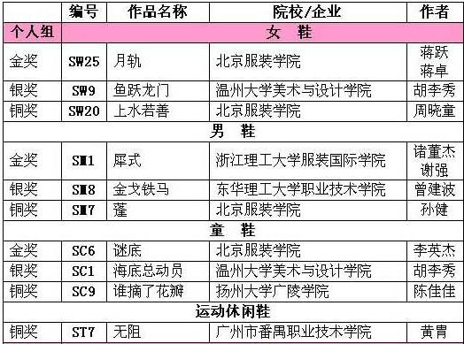 本次大賽評比分個人組和專業組,在經過3月份緊張的初賽效果圖角逐后,共有125件作品入圍,并進入決賽,其中個人組48件作品,專業組77件作品。參賽類別包括:男鞋、女鞋、童鞋和運動休閑鞋四大類。本次大賽中共產生了個人組與專業組獎項25項。分別為:個人組10項,其中男鞋、女鞋、童鞋三類作品產生了金銀銅獎各1名,運動休閑類作品金、銀兩個獎項空缺;專業組12項,四類參賽作品分別產生了金銀銅獎各1名;綜合獎項3名。本次大賽所有獲獎作品已經全部報送至2009國際鞋類設計大賽組委會。