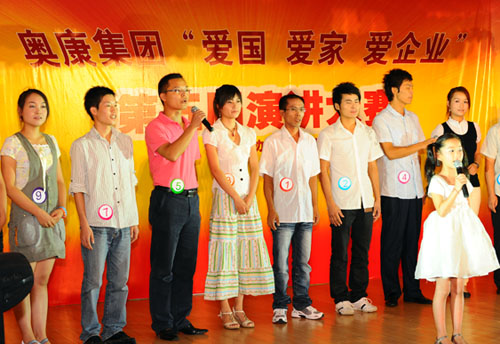 中國鞋網09月01日訊 “災難來臨,我們彰顯了民族大義,因為我們是自信的中國。”8月31日,為慶祝建國60周年,奧康集團黨工團舉辦了一場主題為“愛國、愛家、愛奧康”的演講比賽,來自車間生產一線的員工結合發生在自己身邊真實的故事,用自己飽滿的熱情歌頌祖國大好河山和改革開放所取得的成就。最終來自奧康大學的蔡婧用自己激情演講和真摯的感情打動了評委,贏得此次演講比賽的冠軍。