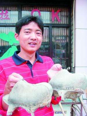瞧,廖海兵手上拿的就是將在鞋展上出現(xiàn)的最老的木屐