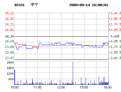 | 李寧代碼:02331.hk | 24.000.30 1.23%2009-09-14 16:00:01 | 昨收:24.30 今開:24.00 成交:22,110最高:24.05 最低:23.55 均價:23.94流通:10.39億 市值:249.41億 換手:0.00% |