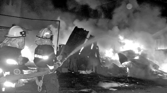現場600多平方米的簡易搭蓋的石瓦廠房陷入一片火海中,燃起的火舌足有十多米高,靠近廠房一側的民房正被熊熊火焰烘烤,幾個面向廠房的樓層玻璃已破碎,外墻上掛著的空調已被燒壞。此時,整個廠房早已垮成一片,廠房內堆起來的大量塑料米原材料、半成品正在猛烈燃燒。而廠房上空有3根高壓電線橫過,被火燒斷。