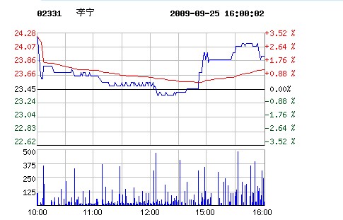 | 李寧代碼:02331.hk | 23.900.45 1.92%2009-09-25 16:00:02 | 昨收:23.45 今開:24.20 成交:14,448最高:24.20 最低:23.30 均價(jià):23.7流通:10.39億 市值:248.37億 換手:0.00% |