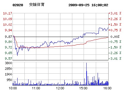 | 安踏體育代碼:02020.hk | 9.980.10 1.01%2009-09-25 16:00:02 | 昨收:9.88 今開:9.88 成交:58,939最高:9.99 最低:9.61 均價:9.84流通:24.91億 市值:248.32億 換手:0.00% |