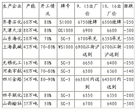 市場期待已久的房地產銷售“金九銀十”和“黃金周”并未實現,PVC今年的旺季需求平淡,現貨市場上從8月以來一直維持觀望看空,成交持續清淡。隨著期價的大幅下跌,各生產廠商的出場報價也有了一定的下調。(見表1)