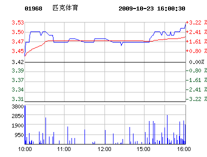 | 匹克體育 代碼:01968.hk | 3.52 0.10 2.92% 2009-10-23 16:00:30 | 昨收:3.42 今開:3.43 成交:55290 最高:3.52 最低:3.43 均價:3.48 流通:20.98億 市值:73.85億 換手:0.00% |