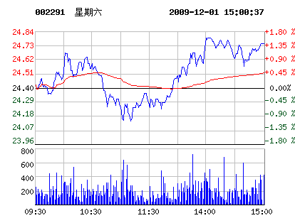 | 星期六 代碼:002291.sz | 24.730.33 1.35%2009-12-01 15:00:37 | 昨收:24.40 今開:24.50 成交:44,759最高:24.80 最低:24.10 均價:24.48 市盈率:-流通:0.55億 市值:53.17億元 換手:8.14% |