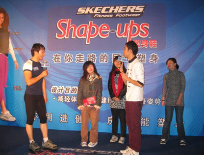 中國鞋網(wǎng)12月08日訊, 上海,2009年11月28日 - 素有全美鞋類最佳銷售成績的著名品牌斯凱奇攜旗下明星產(chǎn)品Shape-ups塑身鞋在浦東正大廣場連續(xù)兩天舉行盛大路演。現(xiàn)場設(shè)有Shape-ups展示區(qū)及體驗區(qū),吸引了眾多消費者林距離接觸Shape-ups塑身鞋。圖為健身教練向消費者演繹如何穿著Shape-ups塑身鞋做運動并消耗卡路里。據(jù)2009年10月12日普林斯頓零售調(diào)查報告顯示,SKECHERS(斯凱奇)憑借Shape-ups塑身鞋,九月份連續(xù)幾周在全球各大城市以周銷售幾百雙的好成績登上鞋類銷售冠軍榜。