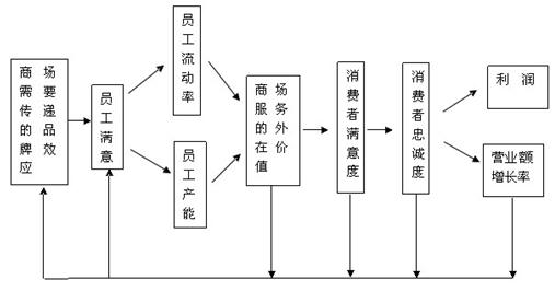 在圖表1中,收益率、消費者滿意度和消費者忠誠度、員工滿意度、員工產(chǎn)能以及員工忠誠度都彼此關(guān)聯(lián)——商場服務(wù)能力或內(nèi)部服務(wù)傳遞系統(tǒng)的質(zhì)量直接影響員工滿意度,即員工滿意度高導(dǎo)致員工流動率低和產(chǎn)能高,而員工流動率低和產(chǎn)能高又會對外部服務(wù)產(chǎn)生積極的影響。價值高的外部服務(wù)導(dǎo)致消費者滿意度提高,高的消費者滿意度又會增加消費者忠誠度;高的消費者忠誠度會增加營養(yǎng)額和利潤。商場外部服務(wù)價值越高,消費者滿意度、忠誠度就越高,商場的營業(yè)額和利潤就越高。