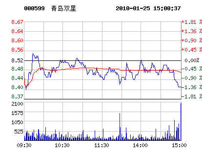 | 青島雙星代碼:000599.sz | 8.400.12 1.41%2010-01-25 15:00:37 | 昨收:8.52 今開:8.46 成交:47,866最高:8.55 最低:8.38 均價:8.45 市盈率:-流通:5.25億 市值:44.09億元 換手:0.91% |