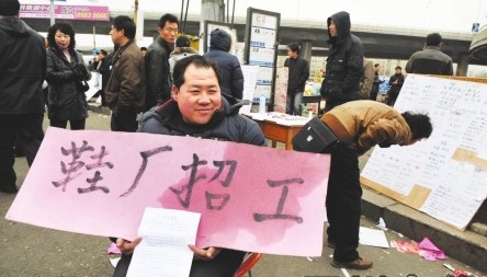 為吸引務工人員,鞋廠工作人員舉著牌子招工
