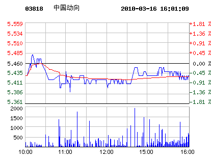 | 中國動向代碼:03818.hk | 5.430.03 0.55%2010-03-16 16:01:09 | 昨收:5.46 今開:5.43 成交:47,112最高:5.48 最低:5.37 均價:5.42流通:56.66億 市值:307.69億 換手:0.00% |